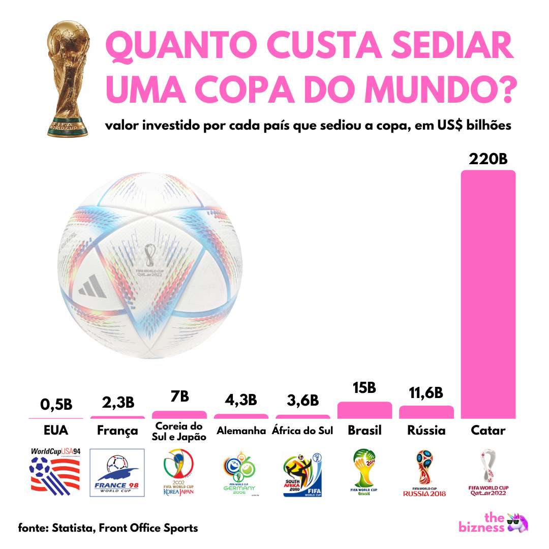 O principal gasto foi, de longe, com infraestrutura — hotéis, rede de metrô, aeroportos, novas estradas e instalações esportivas e outros.Já os estádios representaram “apenas” 5% do montante total. “Apenas” porque esses 5% são cerca de US$ 11 bilhões — quase o gasto total da Copa de 18.E vale a pena investir tanto? 💰