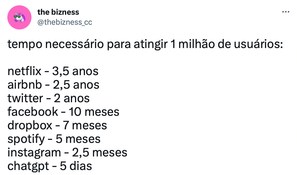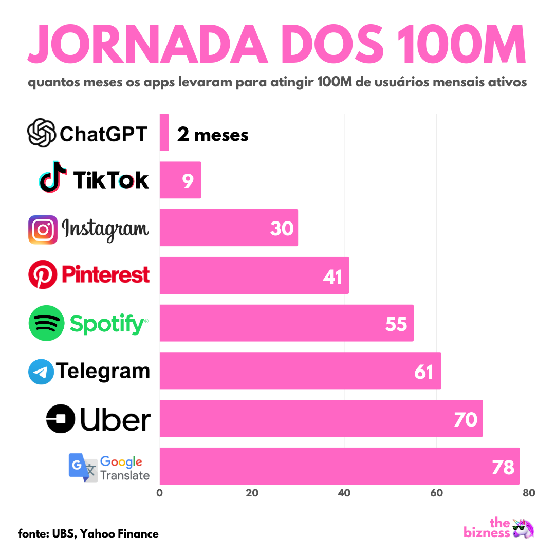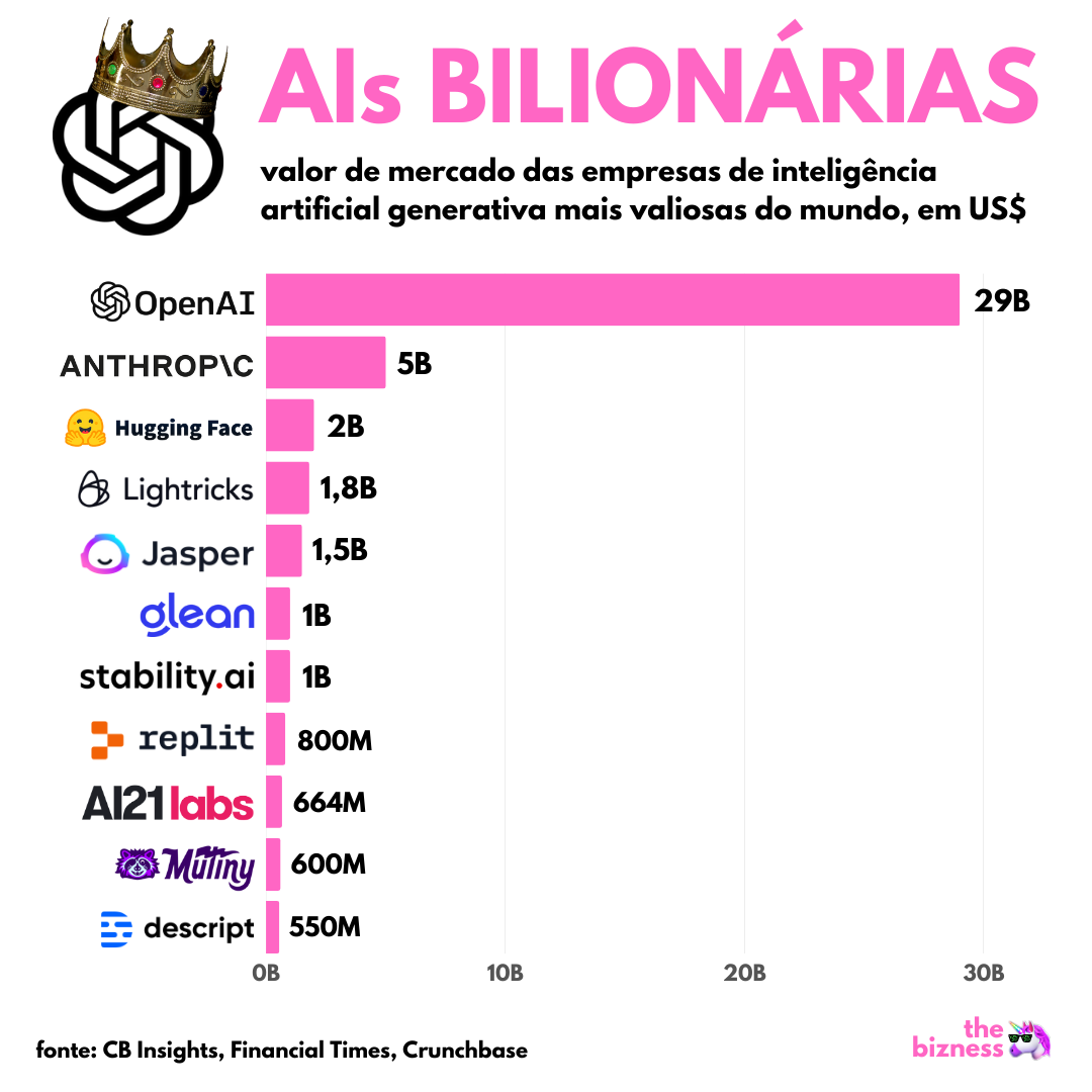 Basicamente, são as AIs que podem ser usadas para criar novos conteúdos, como áudios, códigos, textos, imagens, vídeos e muito mais.- A mais famosa delas — e líder do ranking — é o próprio ChatGPT, da OpenAI, que, recentemente, foi investida pela Microsoft, sendo avaliada em quase US$ 30 bilhões.