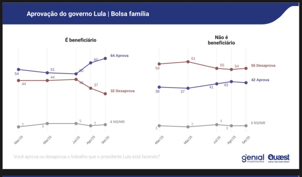 O destaque está entre no recorte entre beneficiários do Bolsa Família. Nesse grupo, a aprovação de Lula subiu para 64%, contra 32% de desaprovação — um grande contraponto aos que não recebem benefícios governamentais, que desaprovam o Lula III em 55%.