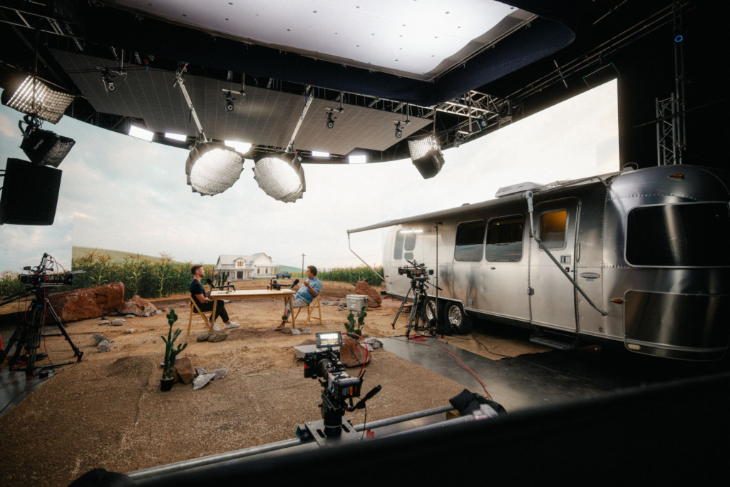 Alugou o maior painel de LED do Texas, colocou um trailer Airstream no cenário, recriou a casa do filme, cercada por milharais, em uma ferramenta de criação de ambientes 3D e decorou a parte da frente com terra, pedras e cactos para gerar a sensação de que a mesa está dentro do cenário.